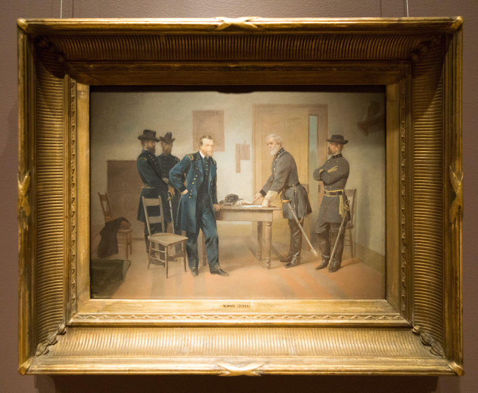 Reproductions of "Lee Surrendering to Grant at Appomattox" are superior to prints, offering rich textures and colors that capture the essence of the original artwork.