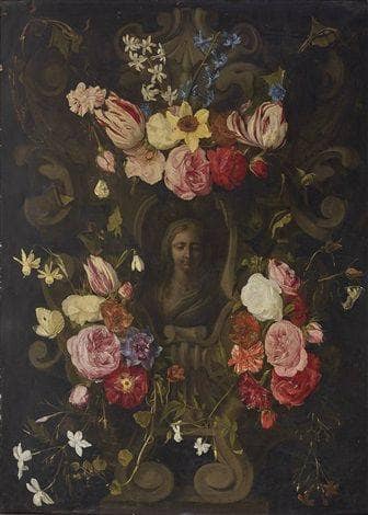 Stone cartouche with Madonna, surrounded by Flower Garlands