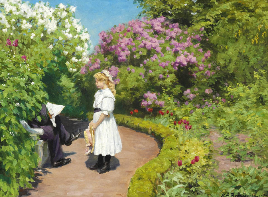 Summer is a season of joy and vitality, and Brendekilde captures this essence beautifully. The bright sunlight and blooming flowers evoke a sense of warmth and happiness. These seasonal elements not only set the scene but also symbolize the fleeting nature of childhood, reminding us to cherish these moments.